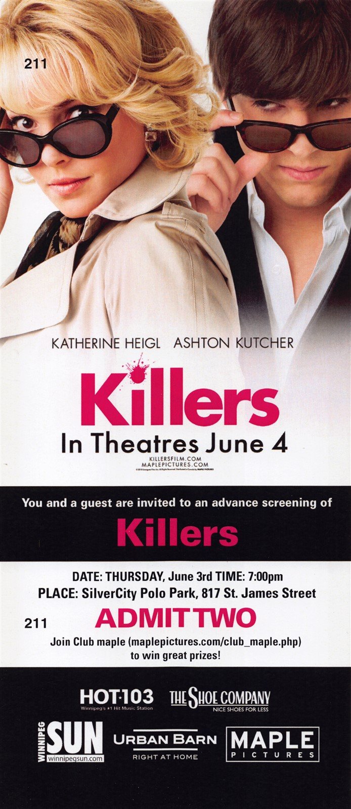 A n-mint condition 2010 color premiere ticket for KILLERS starring Katherine Heigl, Ashton Kutcher, Tom Selleck and Catherine O'Hara.