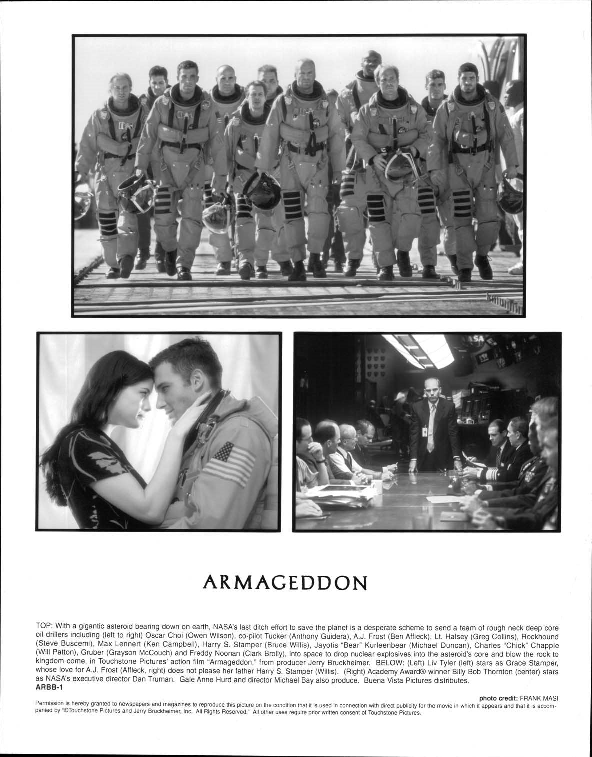 An excellent condition 1999 Touchstone Pictures original promotional 8x10 press photo for ARMAGEDDON starring Bruce Willis, Liv Tyler and Ben Affleck. These were mailed out to media and theater chains promoting the upcoming release of the film.