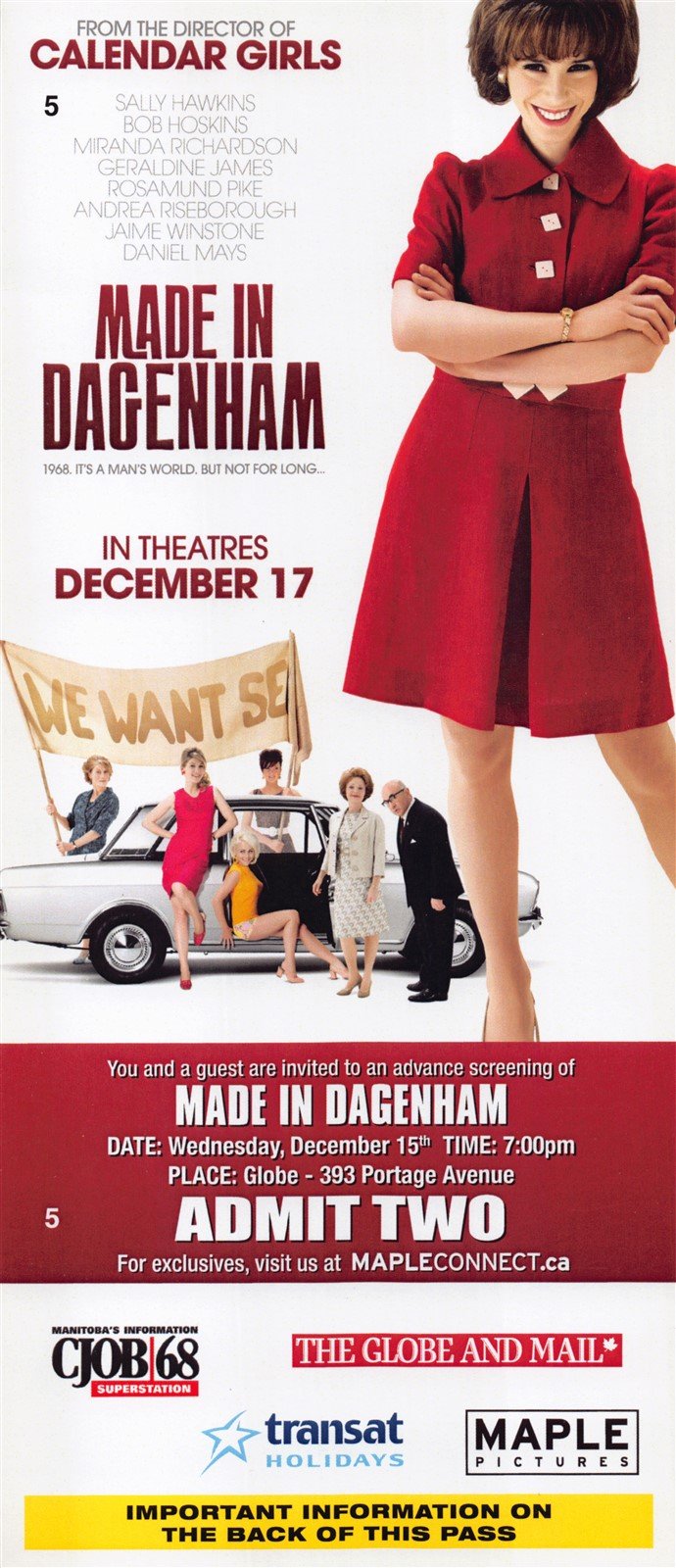 A n-mint condition 2010 color premiere ticket for MADE IN DAGENHAM starring Sally Hawkins and Bob Hoskins.