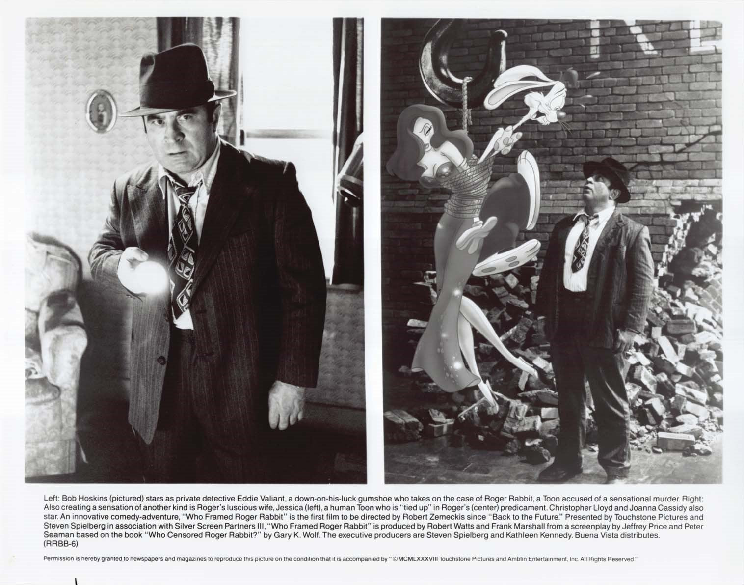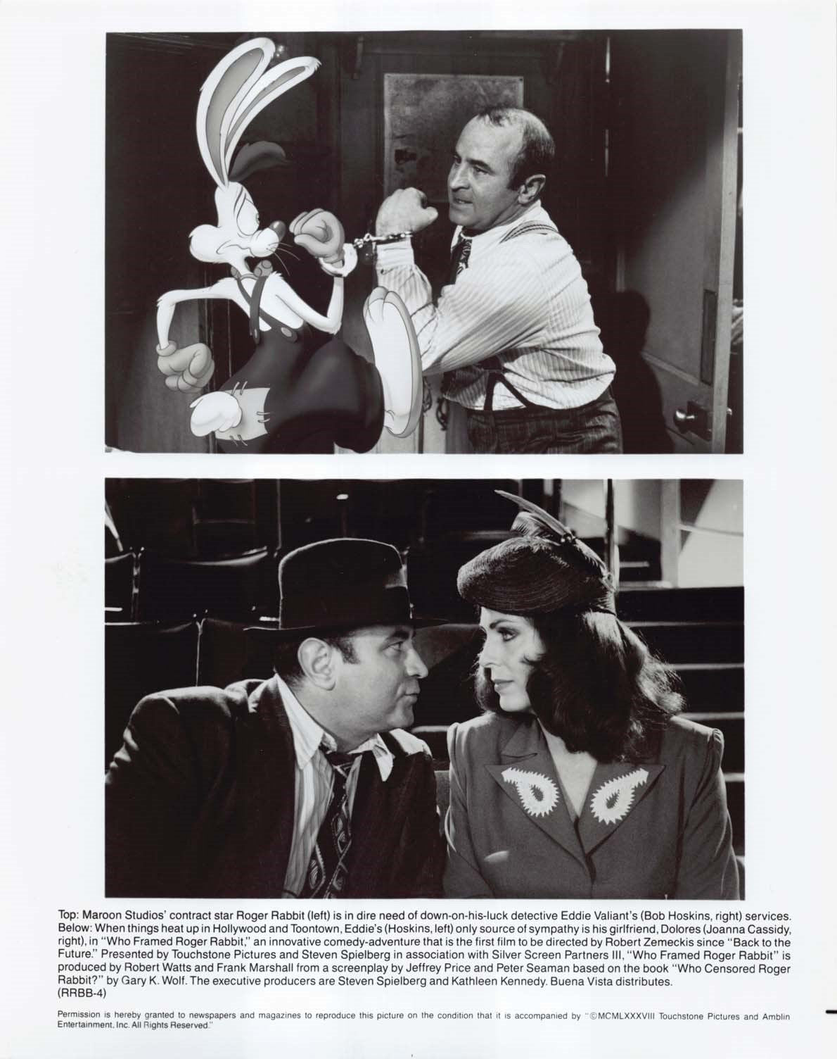 Three (3) excellent condition 1988 vintage Disney Pictures original promotional 8x10 press photos for WHO FRAMED ROGER RABBIT? starring Joanna Cassidy, Christopher Lloyd, Kathleen Turner and Bob Hoskins. These were mailed out to media and theater chains promoting the upcoming release of the film.