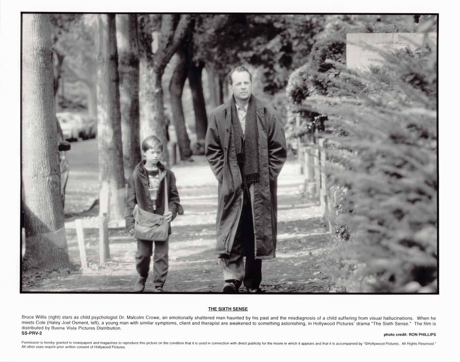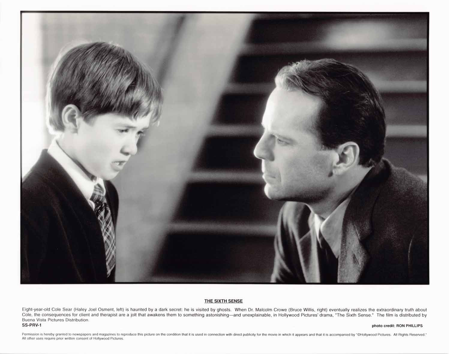 Two (2) excellent condition vintage Touchstone original promotional 8x10 press photos for THE SIXTH SENSE starring Bruce Willis and Haley Joel Osment. These were mailed out to media and theater chains promoting the upcoming release of the film.