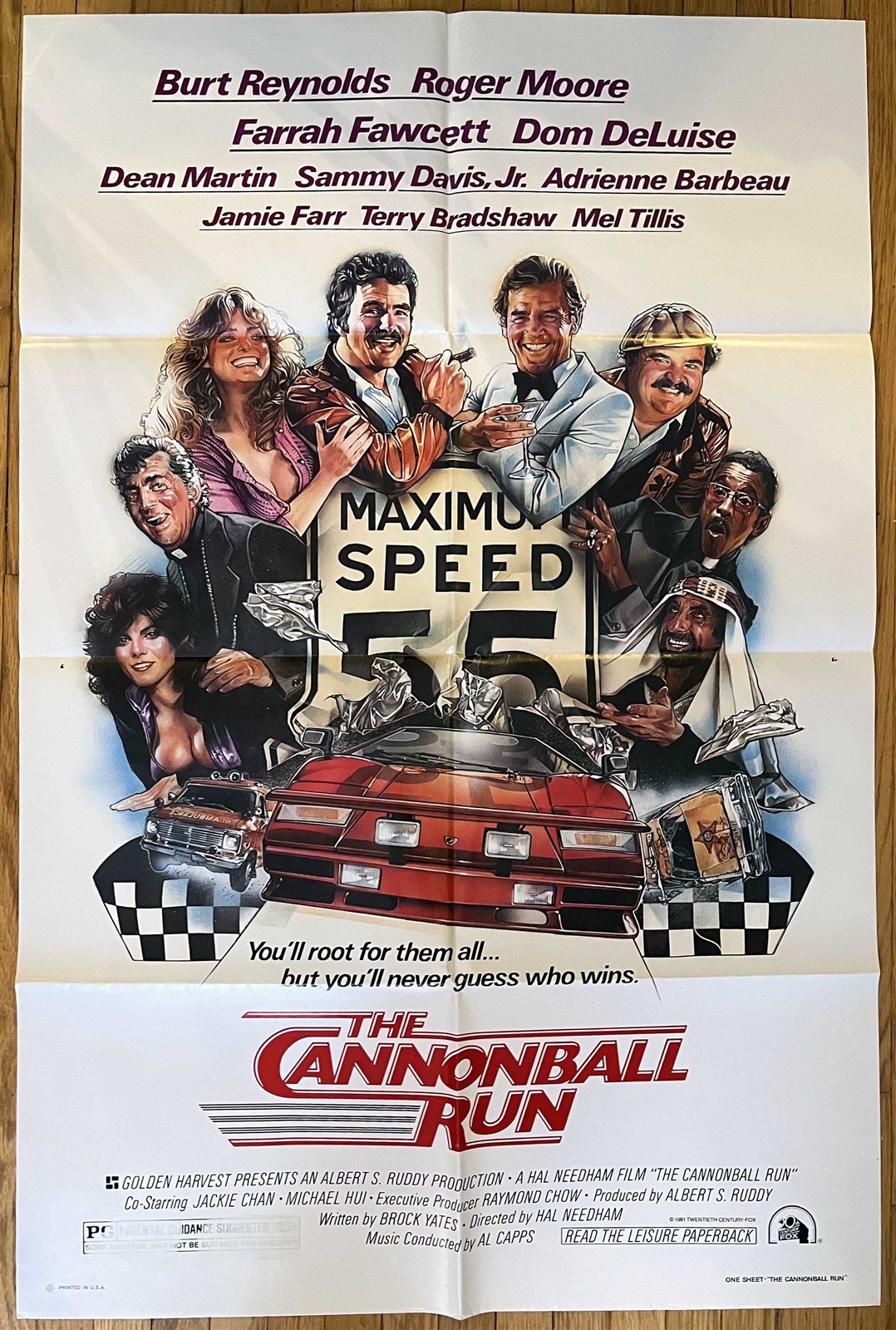 An excellent condition folded original 1-sheet poster for THE CANNONBALL RUN starring Burt Reynolds, Dom DeLuise, Sammy Davis Jr., Roger Moore, Farrah Fawcett, Bianca Jagger, Dean Martin and Jackie Chan. Would look great framed (see photo).