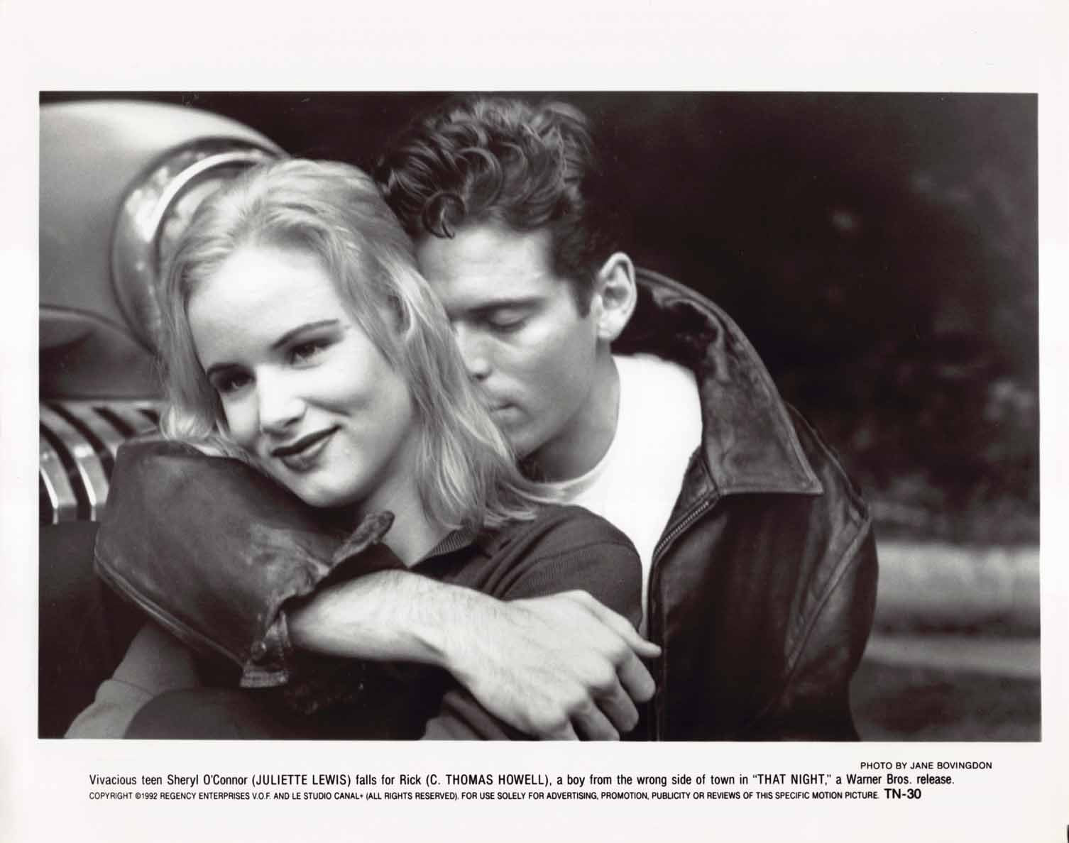 An excellent condition 1992 Warner Bors Pictures original promotional 8x10 press photo for THAT NIGHT starring C. Thomas Howell and Juliette Lewis. These were mailed out to media and theater chains promoting the upcoming release of the film.