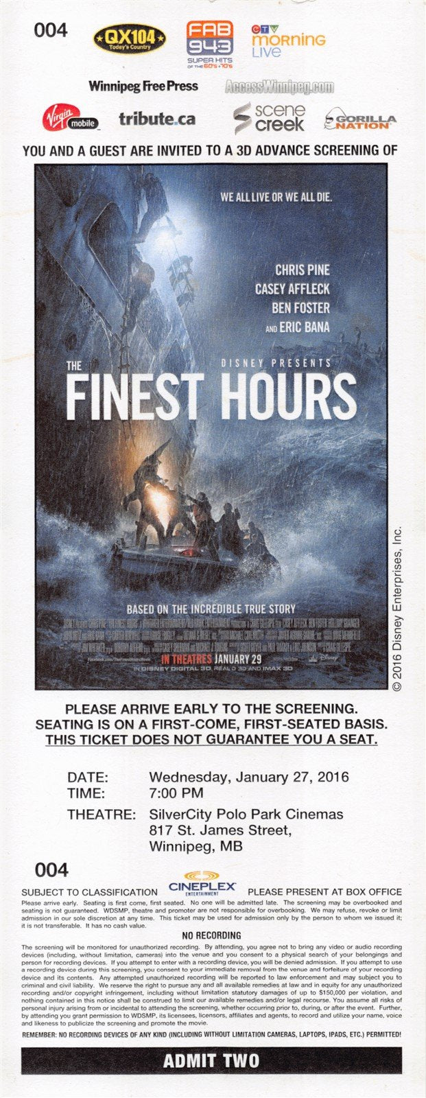 A n-mint condition 2016 color movie premiere ticket for "THE FINEST HOURS" starring Eric Bana, Casey Affleck, Ben Foster and Chris Pine.
