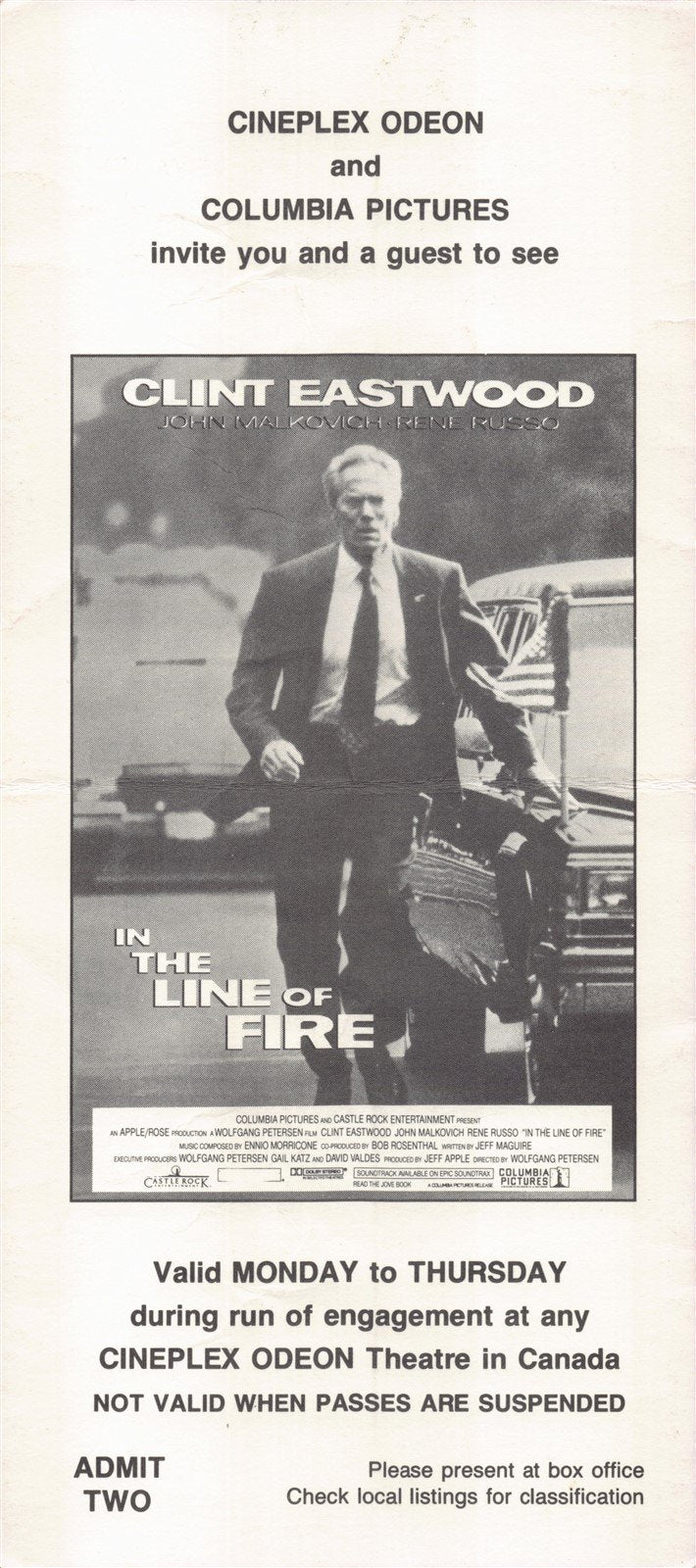 A good condition 1993 run of engagement ticket for IN THE LINE OF FIRE starring Rene Russo and Clint Eastwood. Ticket folded, crease visible.