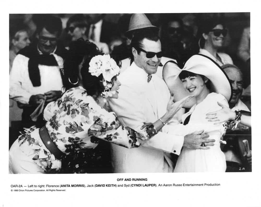 A mint condition 1990 vintage Orion Pictures original promotional 8x10 press photo for OFF AND RUNNING starring D.avid Keith, Anita Morris and Cyndi Lauper.