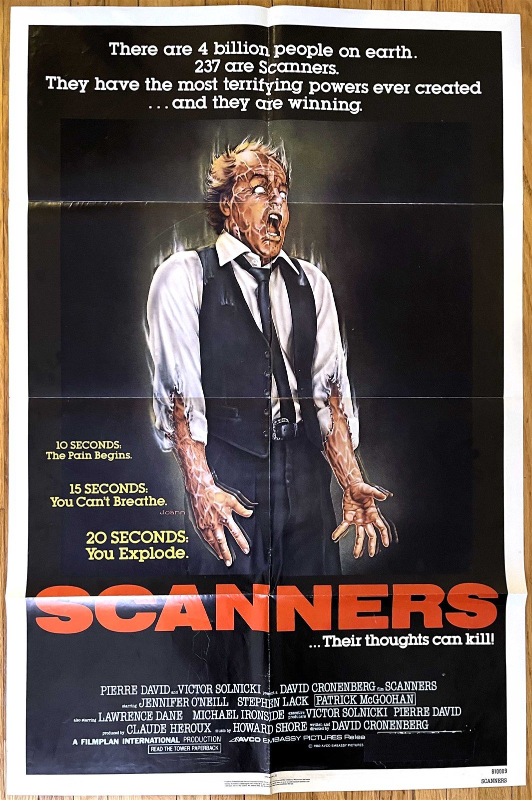 An excellent condition folded original 1-sheet poster for David Cronenberg's classic SCANNERS starring Jennifer O'Neill, Stephen Lack, Patrick McGoohan and Michael Ironside. Would look great framed (see photos).