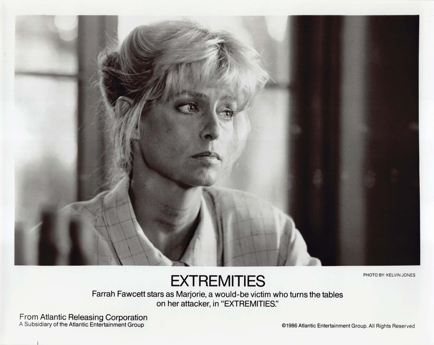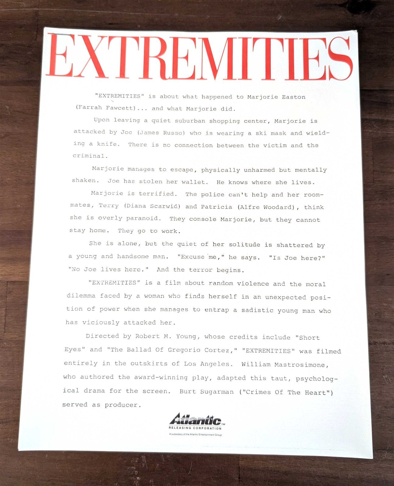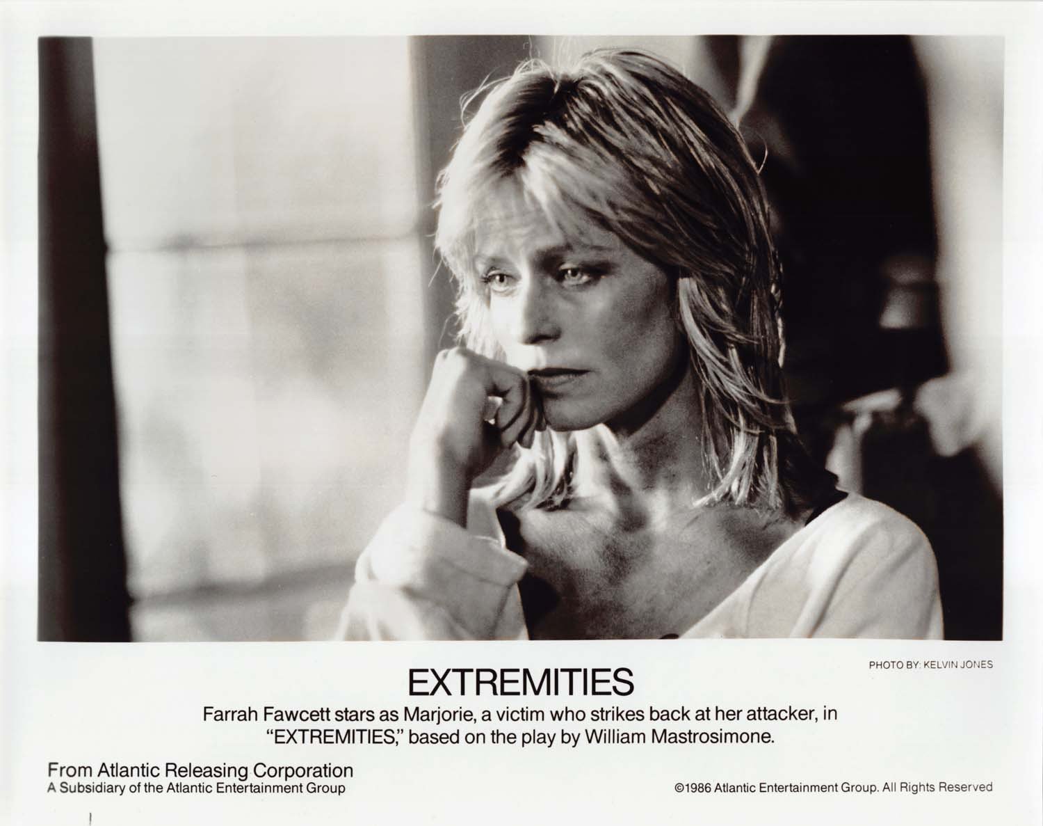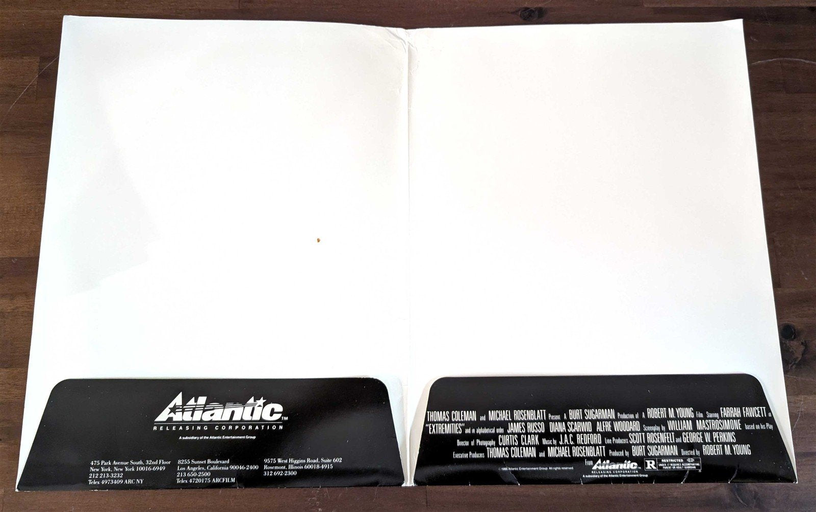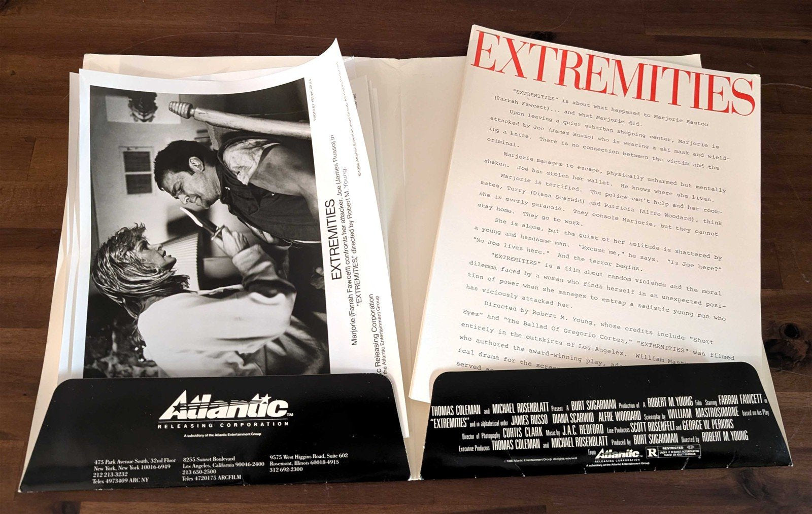 An excellent condition press kit with eight (8) vintage original promotional 8x10 press photos for EXTREMITIES starring Alfre Woodard, James Russo and Farrah Fawcett. These were mailed out to media and theater chains promoting the upcoming release of the film.