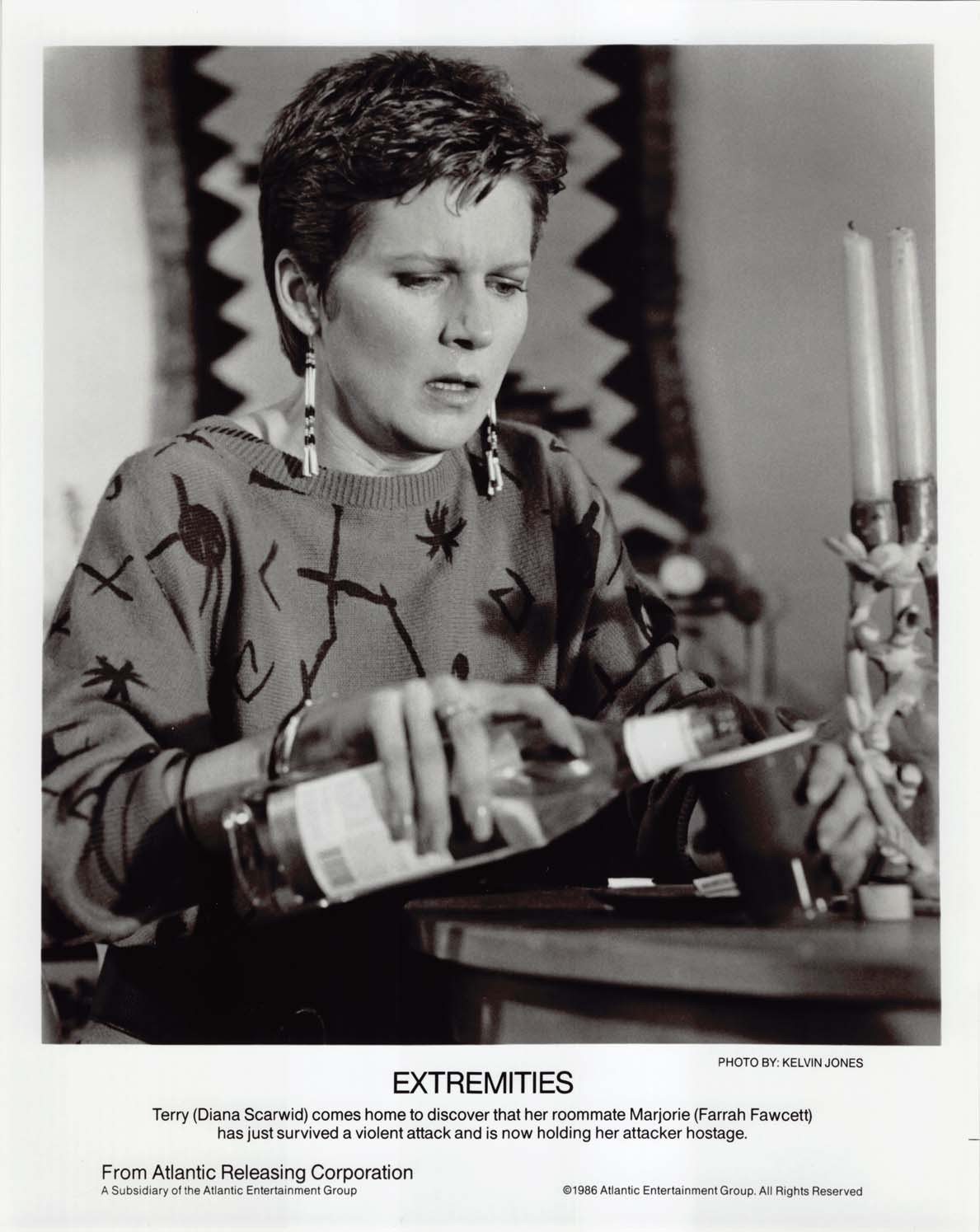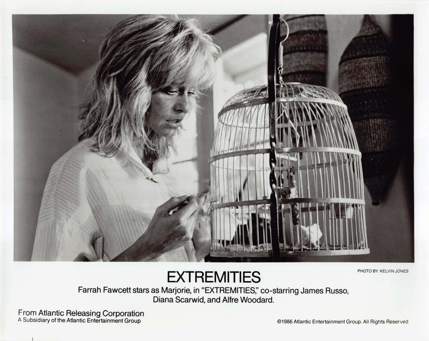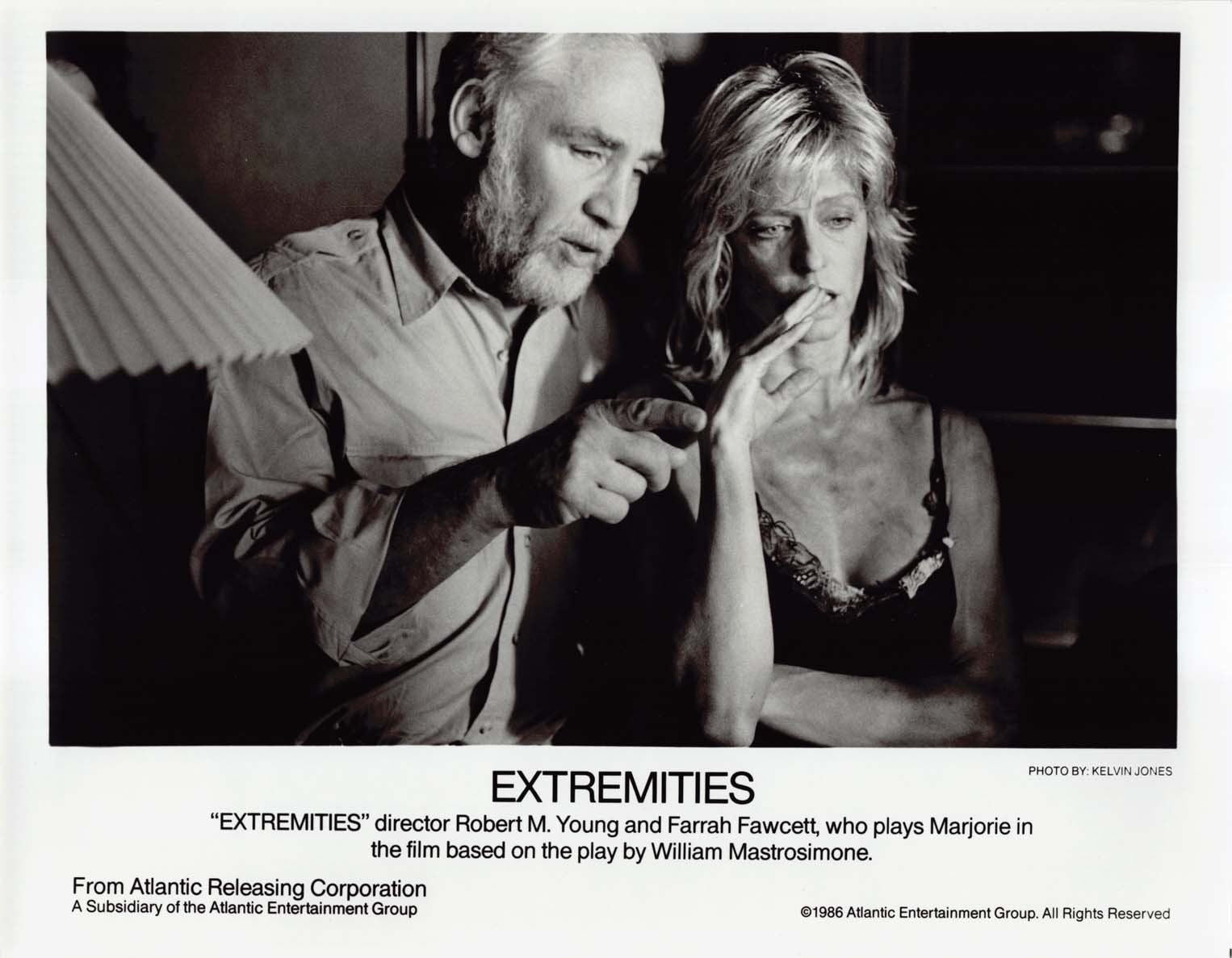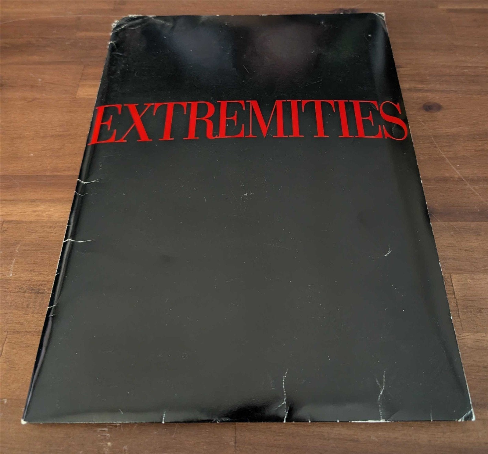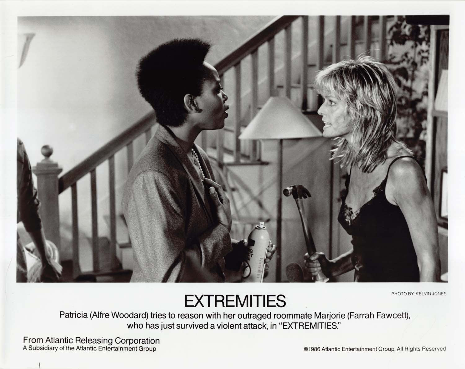 An excellent condition press kit with eight (8) vintage original promotional 8x10 press photos for EXTREMITIES starring Alfre Woodard, James Russo and Farrah Fawcett. These were mailed out to media and theater chains promoting the upcoming release of the film.