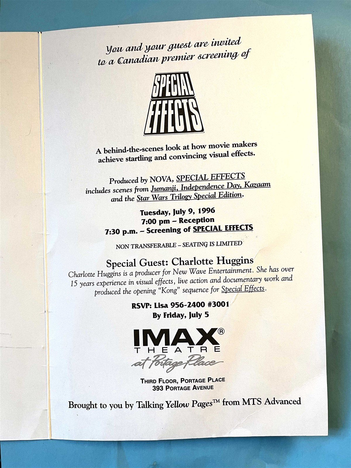 A good condition original premiere invitation (in 1996) to attend the release of Imax's SPECIAL EFFECTS on their big screens. Movie covered such titles at ET, KING KONG and STAR WARS.