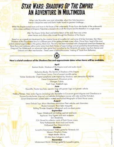 A mint promotional sell sheet issued by Lucasfilm (in 1996) to promote the release of their new multimedia event Star Wars SHADOWS OF THE EMPIRE.