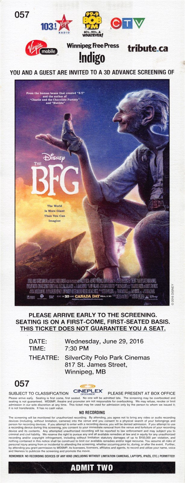 A n-mint condition 2016 color movie premiere ticket for "THE BFG" starring Rebecca Hall and Mark Rylance.