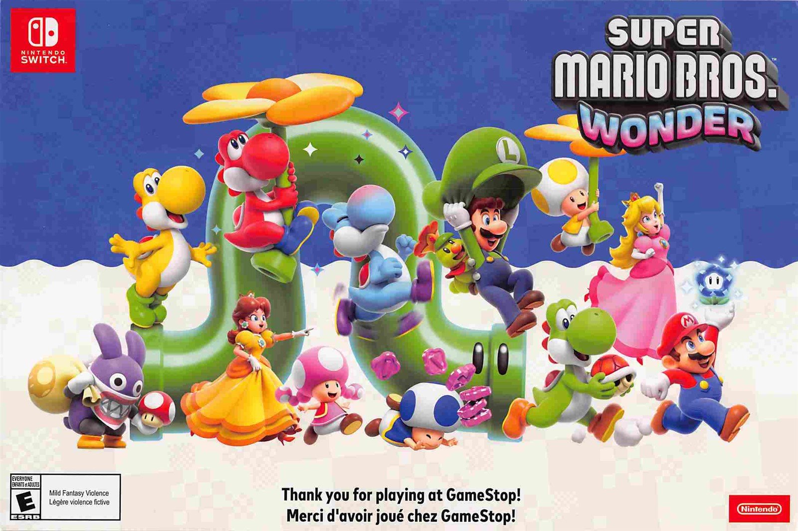 An excellent condition original double-sided card stock promo poster for the Nintendo Switch release of SUPER MARIO BROS. WONDER and MARIO PARTY SUPERSTARS.