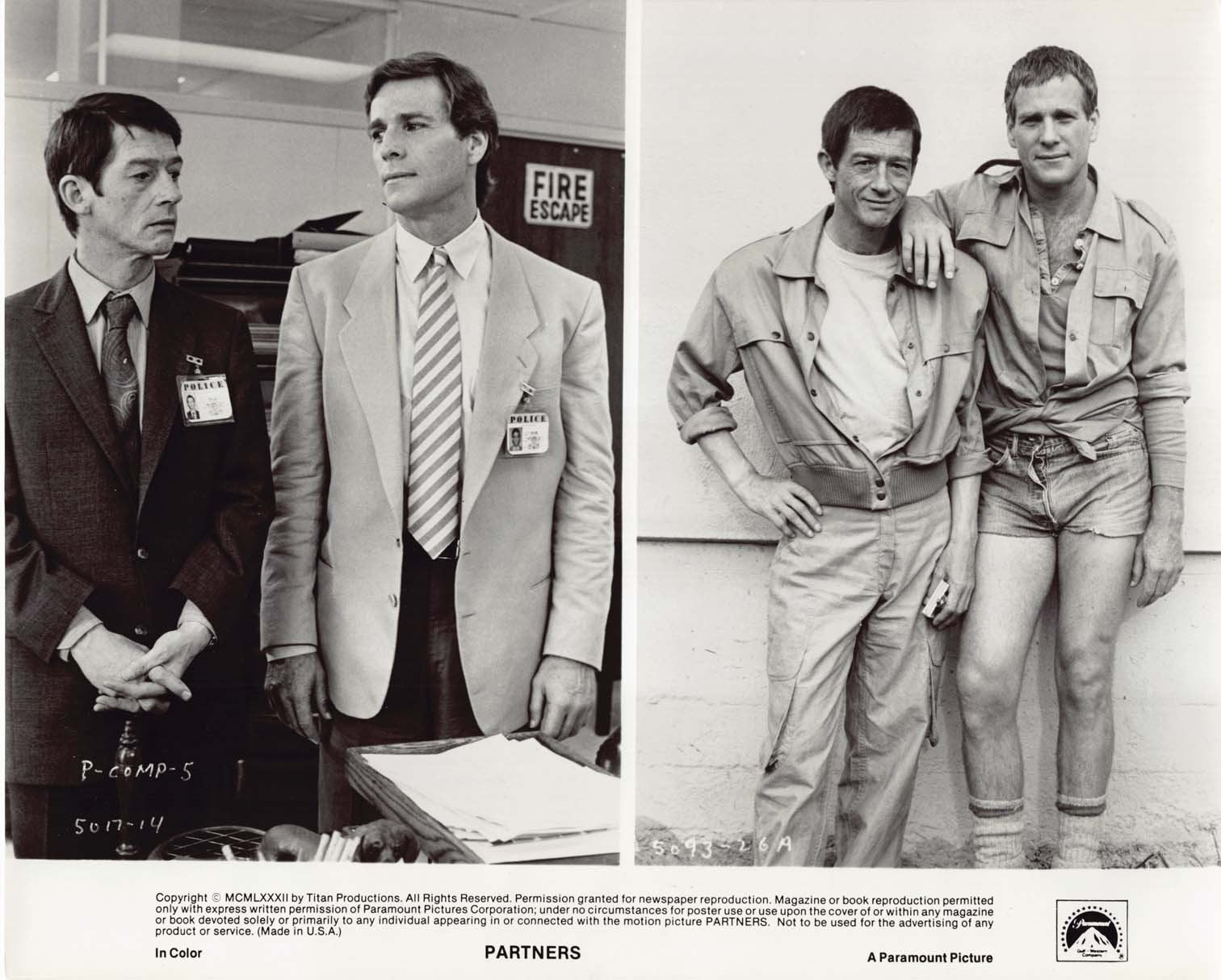 Seven (7) excellent condition 1982 vintage Paramount Pictures original promotional 8x10 press photos for James Burrows' PARTNERS starring John Hurt, Robyn Douglass, Kenneth McMillan and Ryan O'Neal. These were mailed out to media and theater chains promoting the upcoming release of the film.