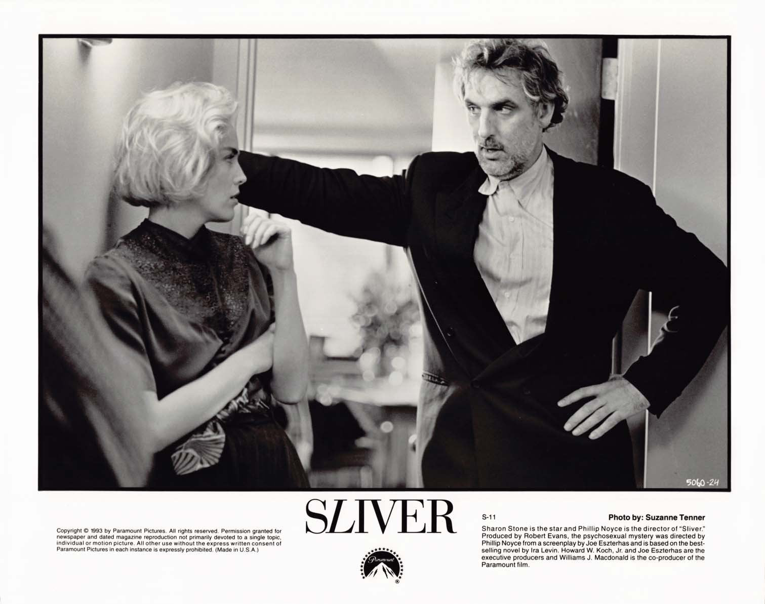 Two (2) excellent condition 1993 Paramount Pictures original promotional 8x10 press photos for SLIVER starring Tom Berenger and Sharon Stone. These were mailed out to media and theater chains promoting the upcoming release of the film.