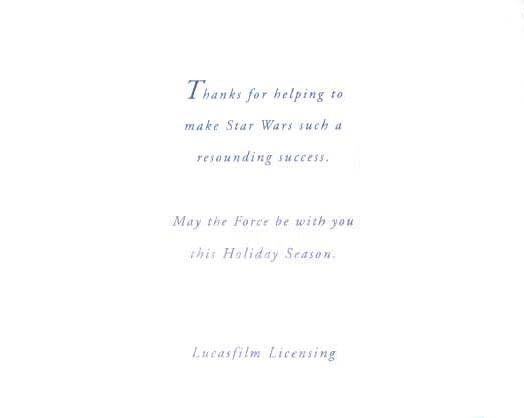 A mint unused Christmas card sent out by LUCASFILM / LUCAS LICENSING - makers of the STAR WARS and INDIANA JONES films. This card was the one sent out to their clients and friends in 1995 - this card features the company logo.