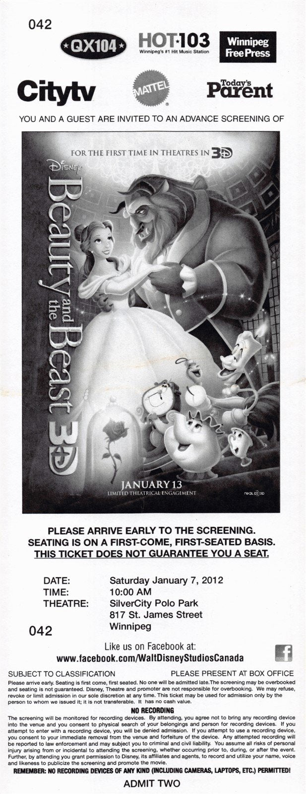 Disney BEAUTY AND THE BEAST 3D original premiere ticket 2012