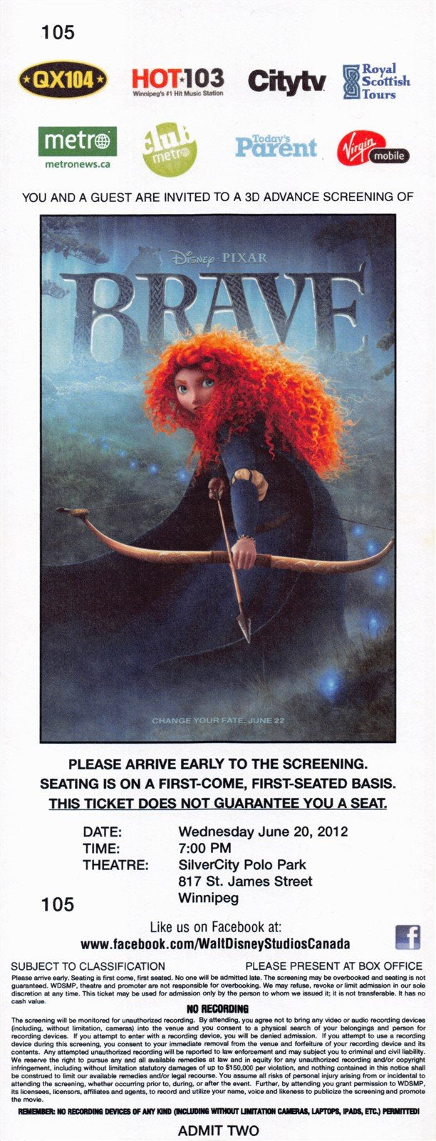 A n-mint condition 2012 color movie premiere ticket for "BRAVE".