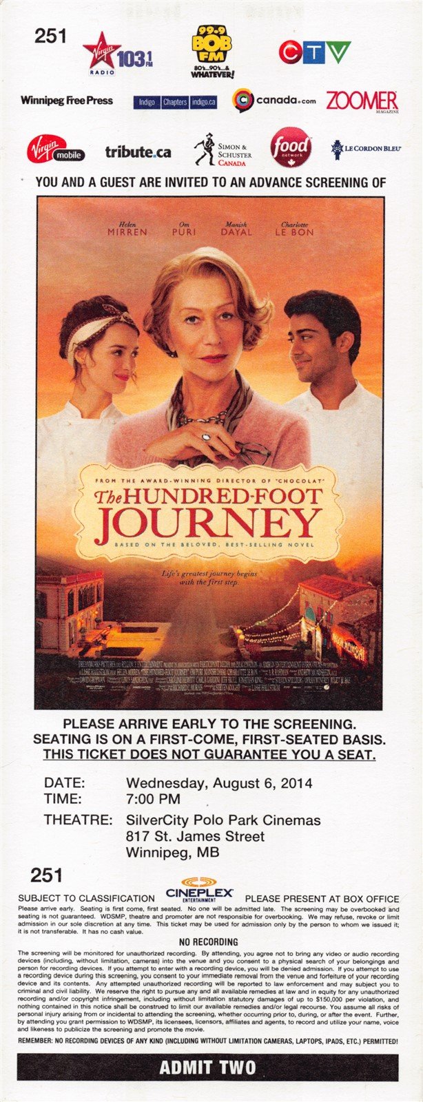 A n-mint condition 2014 color movie premiere ticket for "THE HUNDRED-FOOT JOURNEY" starring Helen Mirren.
