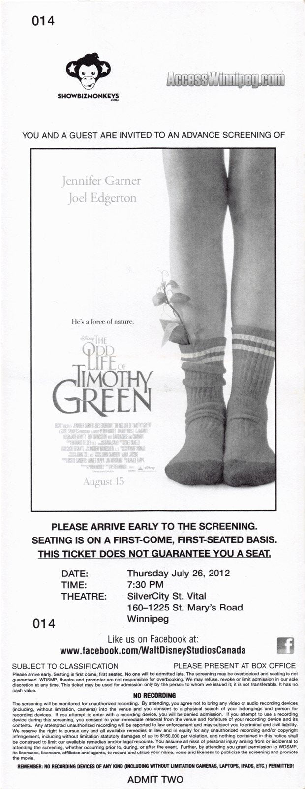 A n-mint condition 2012 movie premiere ticket for "THE ODD LIFE OF TIMOTHY GREEN" starring Joel Edgerton and Jennifer Garner.