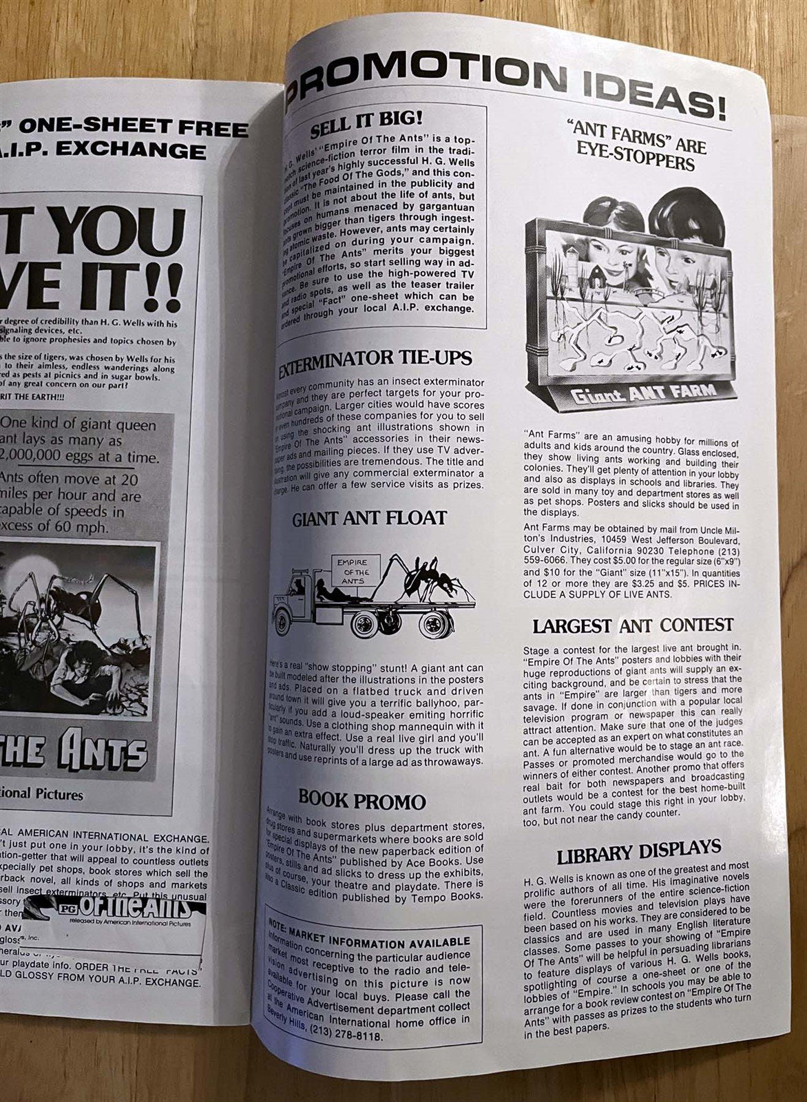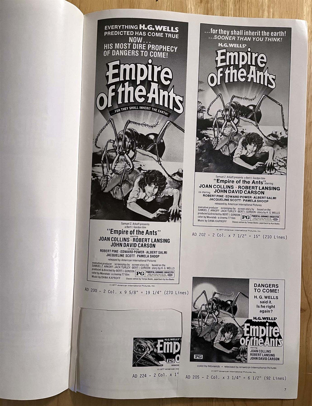 A used 1977 pressbook for the classic shlock horror flick EMPIRE OF THE ANTS starring Joan Collins, Robert Lansing and John David Carson (see photos). Note that 2 of the pages have had the ads cut out but the rest of the book is in fantastic shape. We have priced it based on this fact.