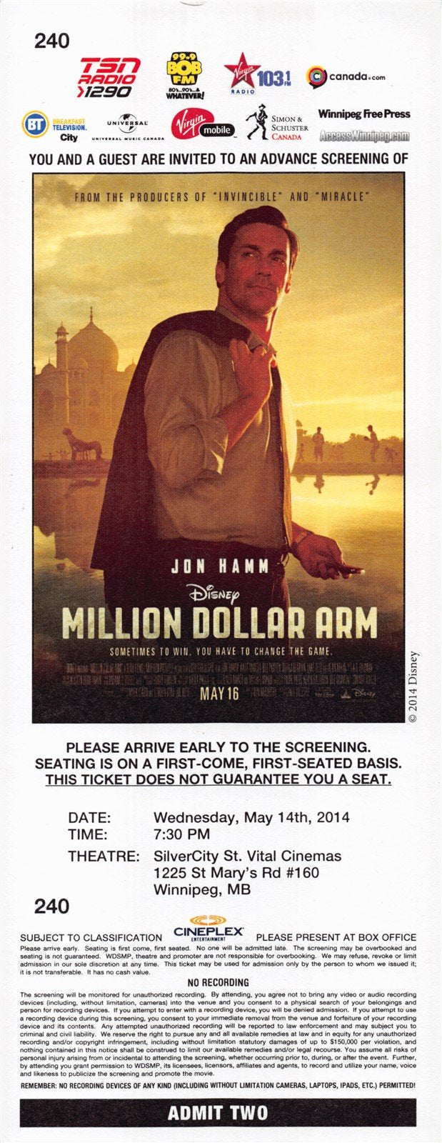A n-mint condition 2014 color movie premiere ticket for "MILLION DOLLAR ARM" starring Jon Hamm.