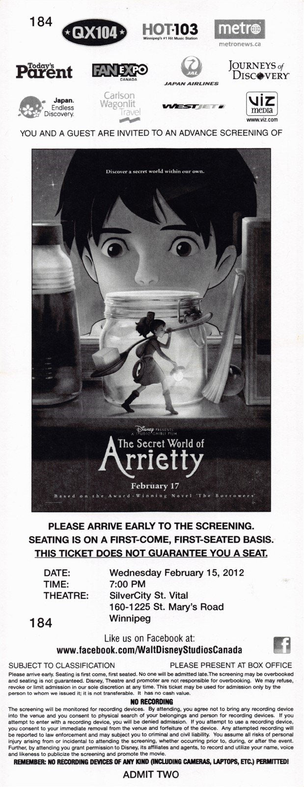 SECRET WORLD OF ARRIETTY original premiere ticket 2012