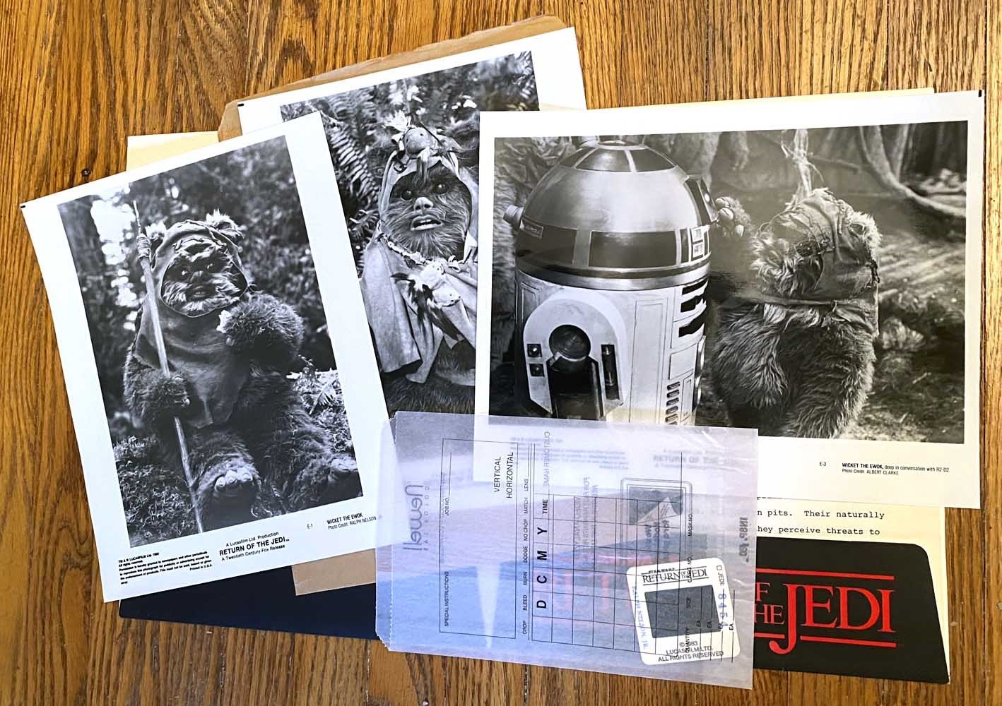An original 1983 STAR WARS press kit, "Introducing the Ewoks" from the EPISODE VI - RETURN OF THE JEDI, including full-color folder, a 2-page press release, (3) 8x10 inch photos and (1) 35mm slide. Folder shows some minor surface wear (see photos).