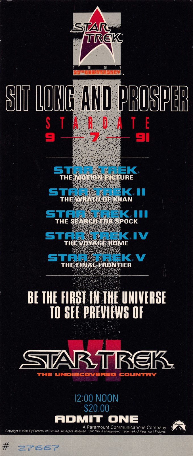 A n-mint condition 1991 Paramount Pictures color movie premiere ticket to see the early screening of "STAR TREK VI - THE UNDISCOVERED" starring Leonard Nimoy, DeForrest Kelley and William Shatner.